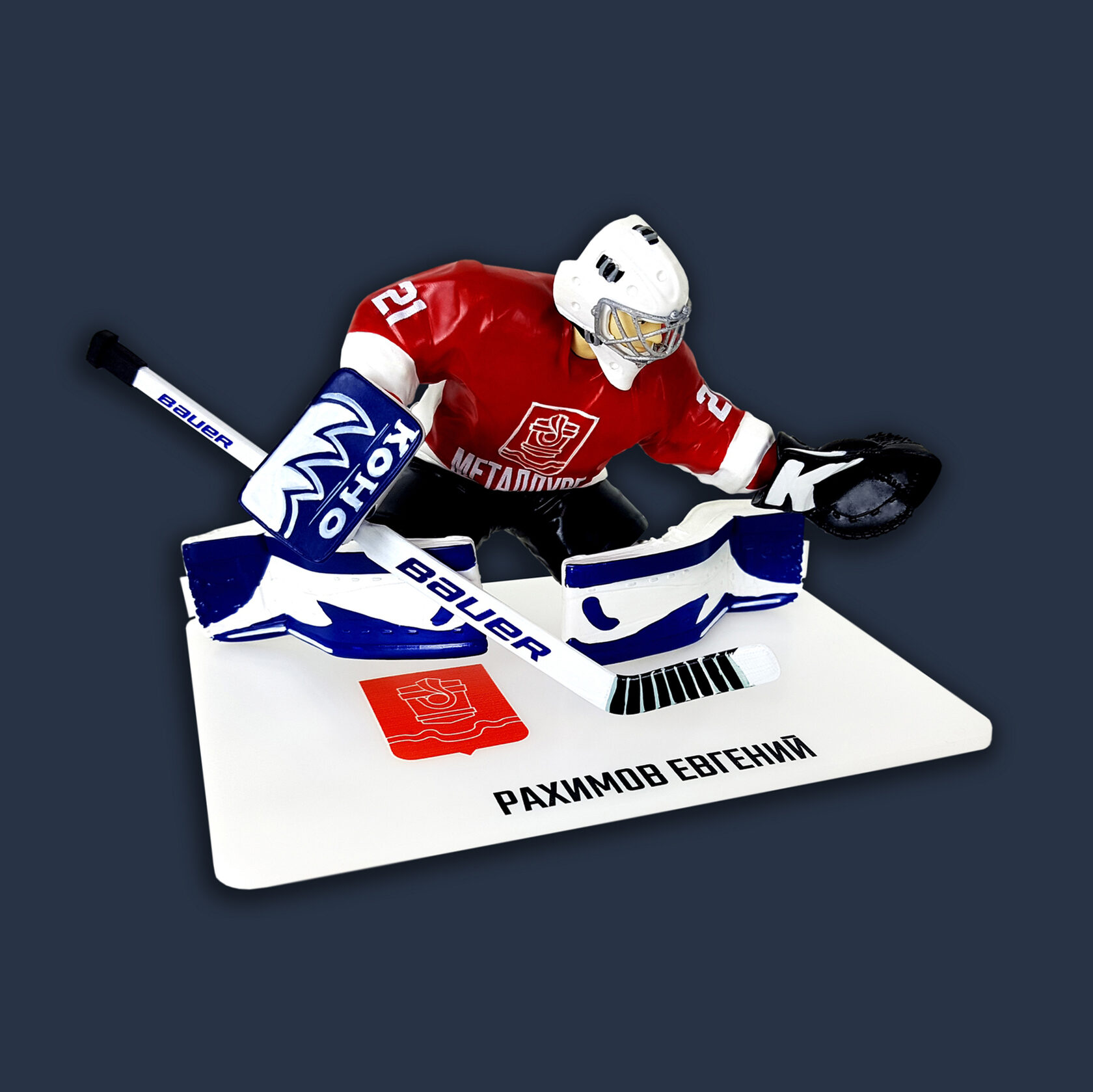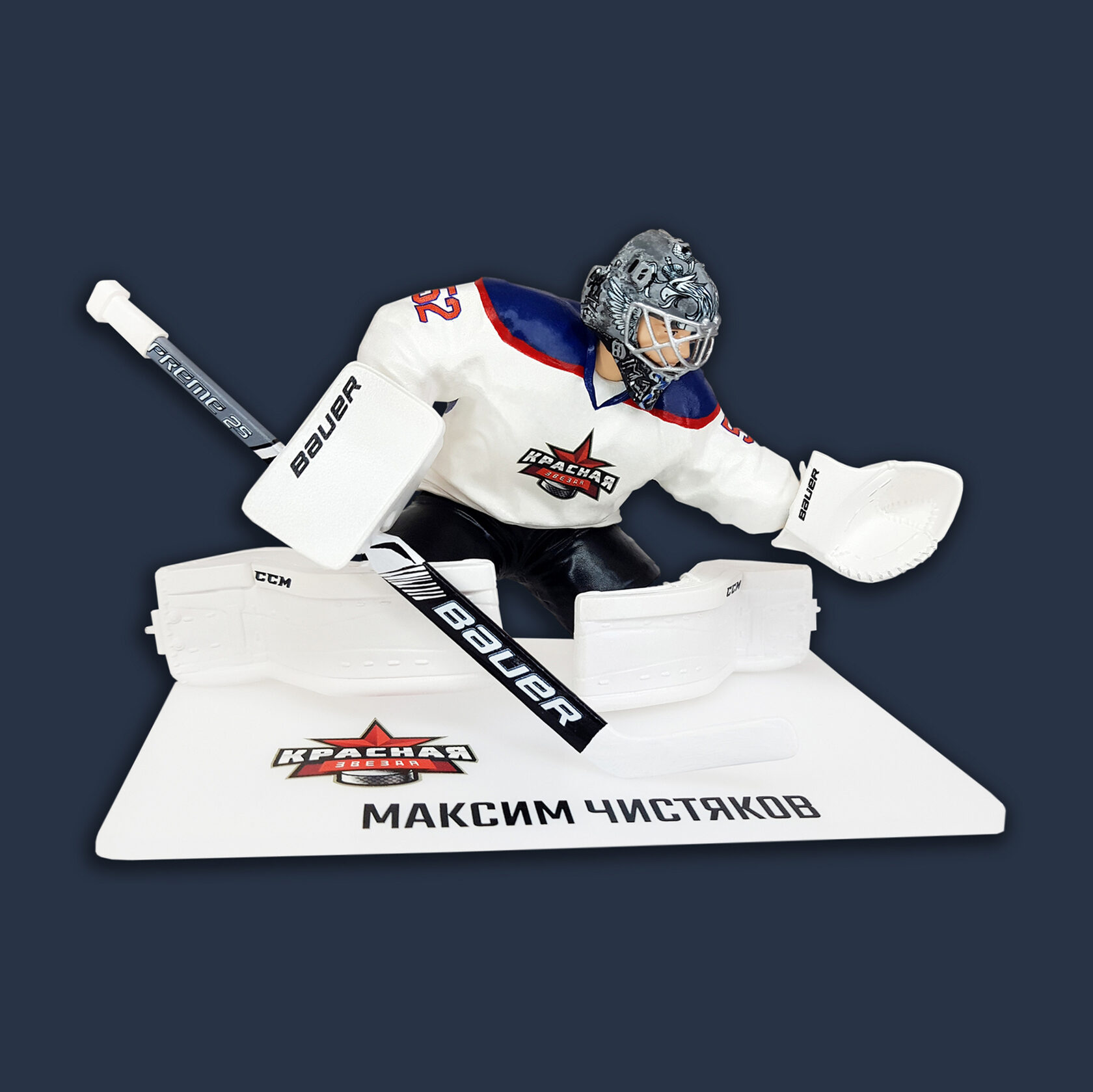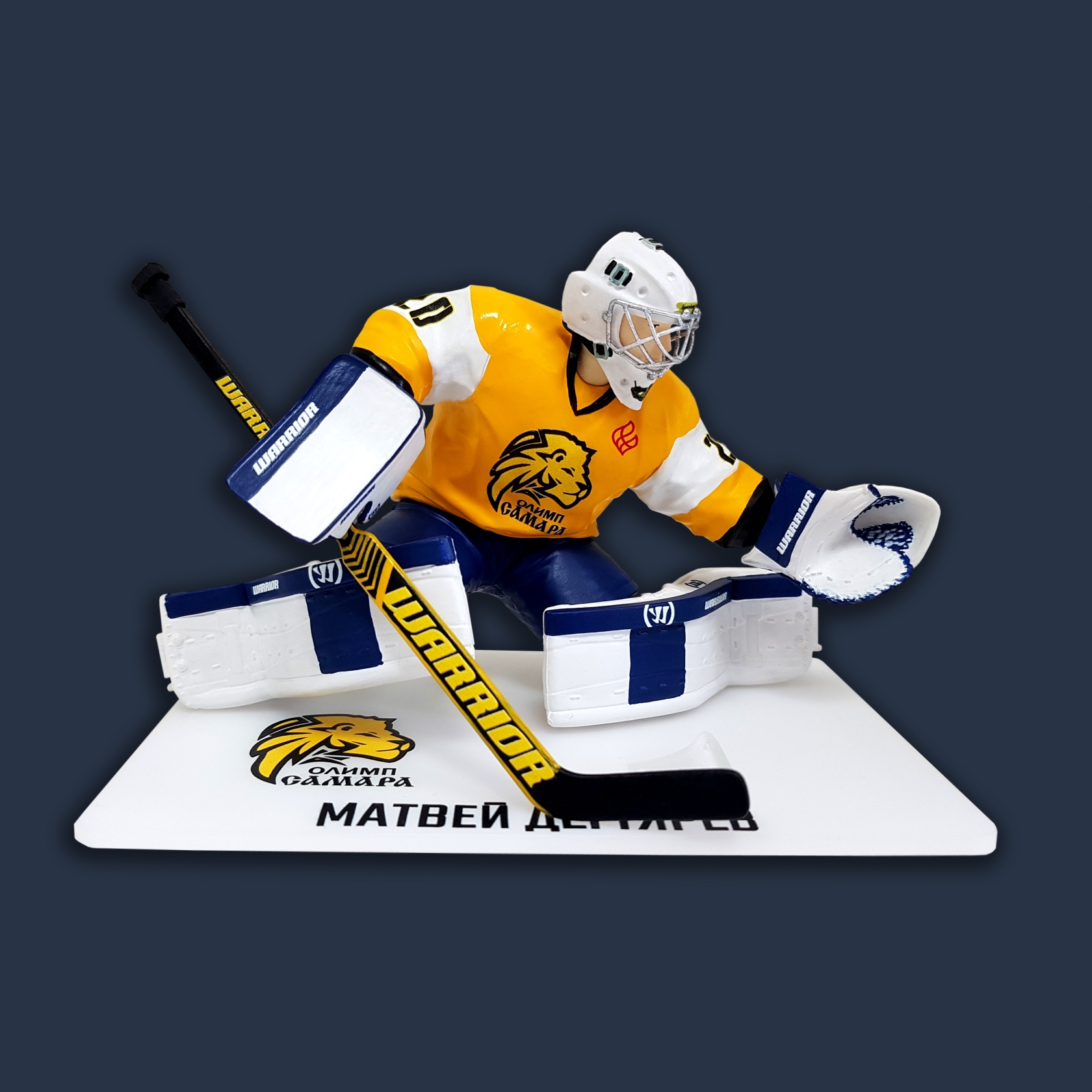 Статуэтка вратяря изготавливается из ударопрочного пластика под заказ, с нанесением логотипа, расцветки вашей команды и вашей фамилии, чтобы максимально приблизиться к оригинальному виду игрока. Ручная сборка и покраска.